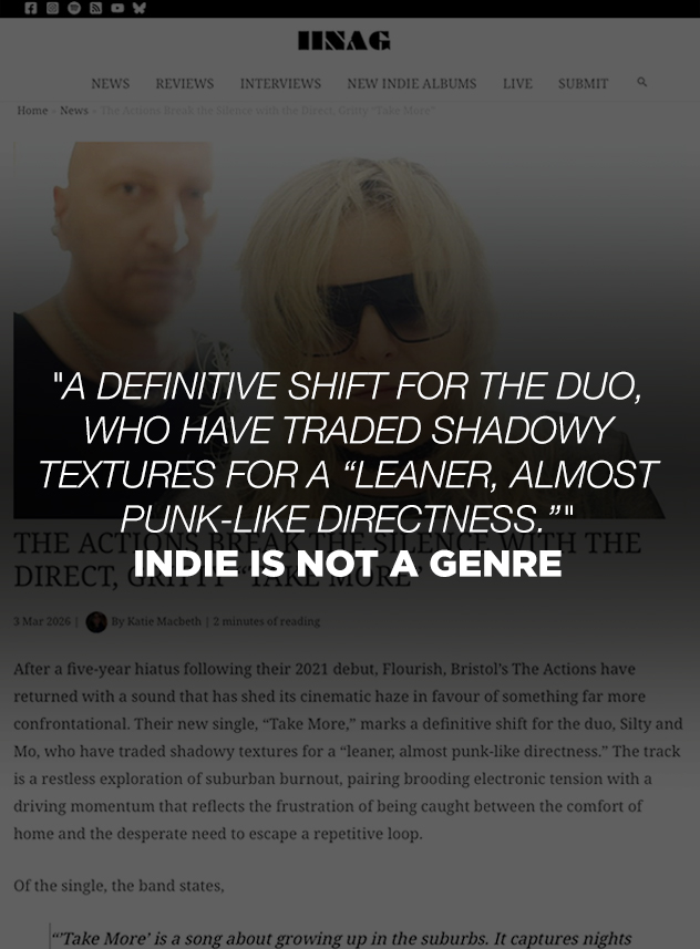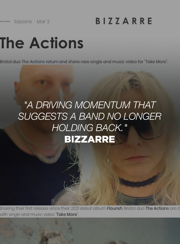 Now entering a new chapter, The Actions are pushing toward a stronger, more direct sonic and lyrical approach. They return with the single ‘Take More’, a sharp, suburban track that has already generated significant momentum being hand-picked for Rough Trade Counter Culture playlist, receiving a double airplay on BBC Introducing West, getting a TV sync placement on E4’s Made In Chelsea, plus a number of press features including BrooklynVegan, Wax Music, Bizzarre, Babystep Magazine, Indie Is Not A Genre. Their sound now feels leaner, louder, and more confrontational—pulling their electronic roots into something closer to raw, restless urgency, with a new album set to release this year.
